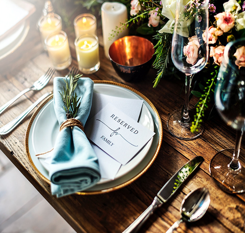 When designing your table, charger plates are placed on the table in front of the guest’s seat—between the flatware, below the drinking glass and one inch from the edge of the table.