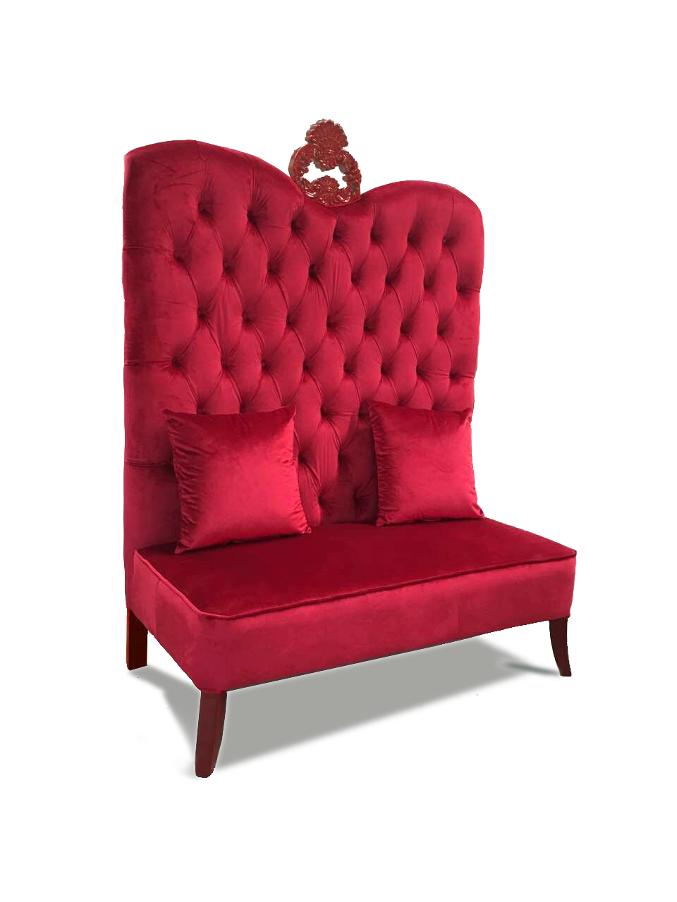 The High back sofa is often used as featured seating for special events. The Red Wine Luxe Line High Back Sofa brings an elegant flair to your event and highlights the guest(s) of honor. The High Back Sofa is often paired with our half-round table and our tablecloth rentals.