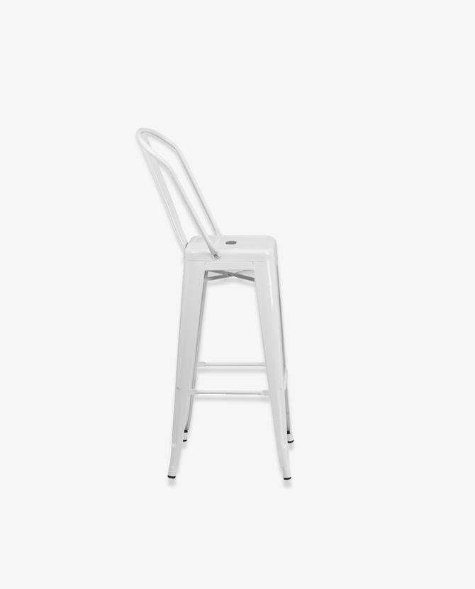 Suitable for Cocktail-Highboy-Bar height tables. This white bar stool features a sleek backrest for added comfort. The high back, Bistro style barstool will give your dining room or bar decor a cool retro-vintage feel.