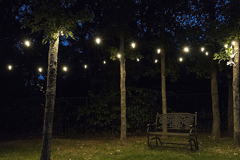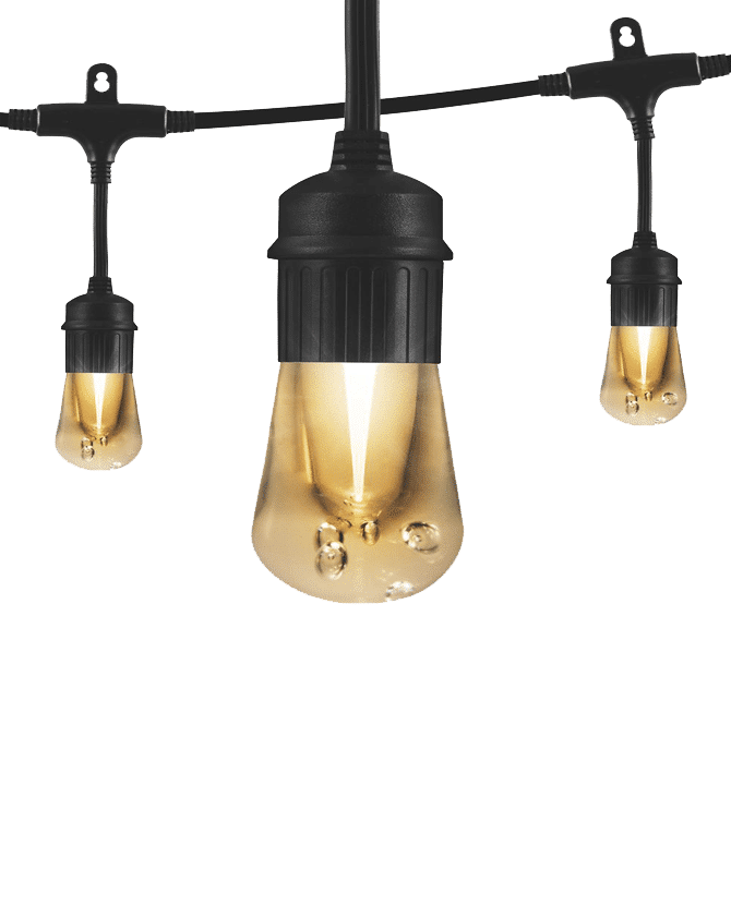- Each strand of the cafe string lights rental Atlanta has end-to-end connections, so you can link multiple sets to achieve the perfect length for any installation. The grounded power cord plugs into any standard outlet, and features an 18″ lead-in from the plug to the first bulb, with a 6″ lead-out from the last bulb to the female mating receptacle to ensure consistent spacing across multiple strands.