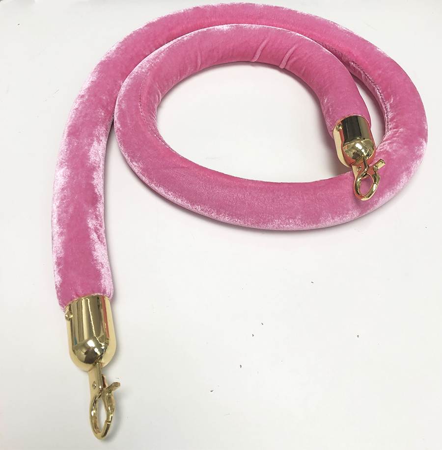 Stanchion rope with brass ends is made of a fibrous core material wrapped in a velour fabric.