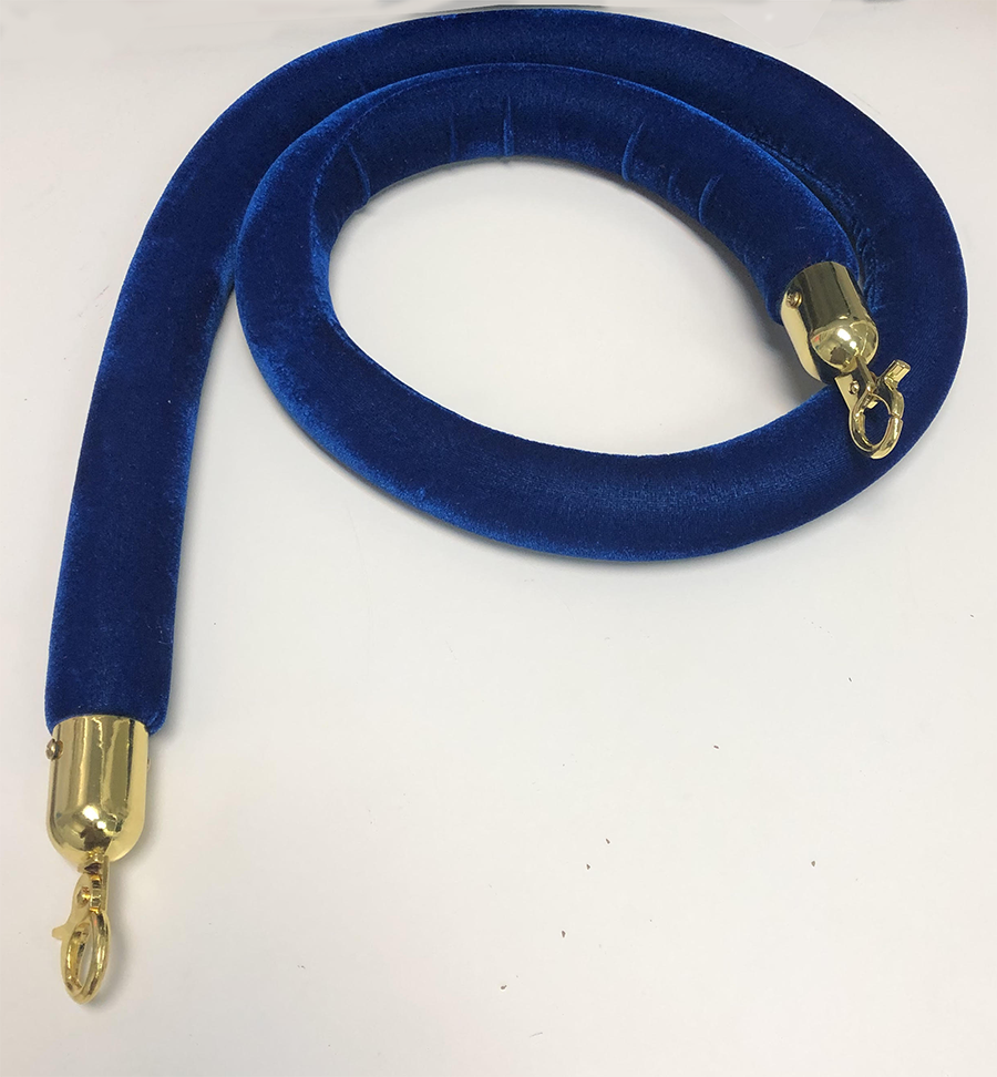 Stanchion rope with brass ends is made of a fibrous core material wrapped in a velour fabric.