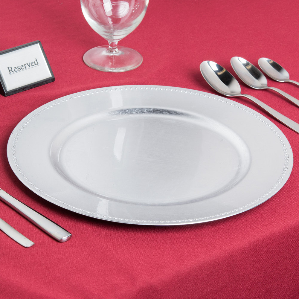 Add a pop of metallic color to your dining area with this 13″ round silver charger plate! Boasting an upscale appearance, in its beaded melamine rim this charger plate is great for enhancing food presentations at your event, party, or outdoor reception.